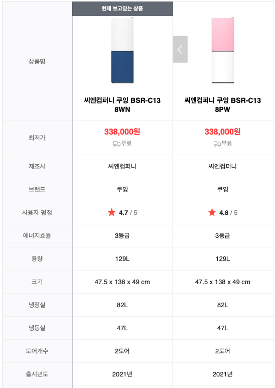 만약 공간이 좁아서 이보다 더 작은 냉장고가 필요한 경우 씨엔컴퍼니 《쿠잉》 브랜드의 제품도 참고해볼 수 있다. 전체 용량은 작지만 냉장고와 냉동실 비율이 6:4에 가까운 크기이기에 냉동실이 큰 냉장고에 해당하는 제품이다.