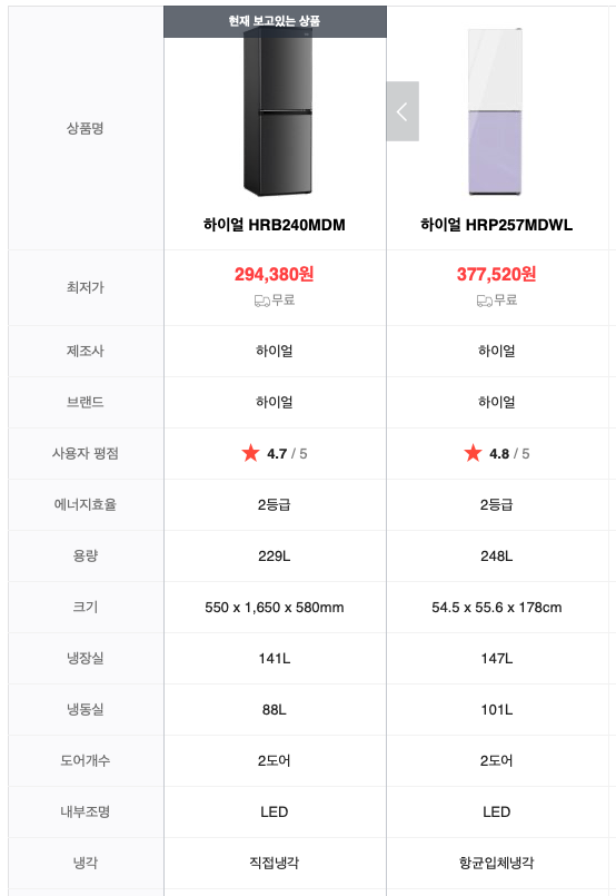 처음에 맘에 든 제품은 HRP257MDWL 인데 비율이 거의 6:4로 냉동실이 무려 101L가 되었다. 색상도 퍼플, 핑크, 베이지 색으로 포인트 되는 색감이 너무 예뻤고 에너지 효율도 2등급으로 나쁘지 않았다. 하지만 우리집에 놓을수있는 냉장고 높이는 166cm 이하여야해서... 높이로 인해 탈락..!